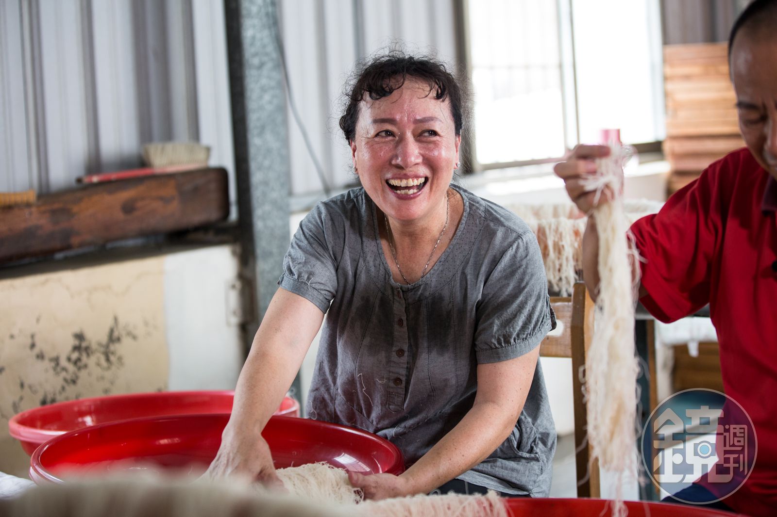 長年勞心又勞力,林美津的雙手也因反覆撕米粉,拇指骨變形腫脹,但靠著一絲又一絲的米粉撐起一個家,前一秒才感性落淚,後一秒隨即擦乾眼淚,擺擺手說:「現在不辛苦了,懂得安排,趕快做好就能休息了。」