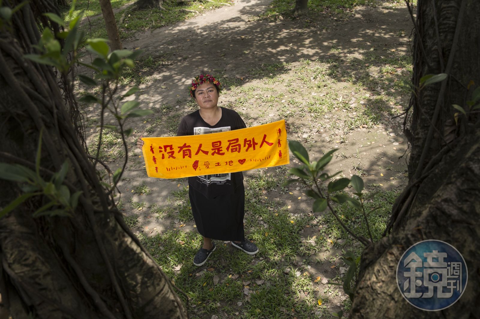 她的脖子上老是披著一條「沒有人是局外人」標語的橘黃毛巾,提醒我們,傳統領域不是原住民的事,也和所有台灣人息息相關。生態人文研究者林益仁教授說:「轉型正義不是只有原住民問題。傳統領域議題是一面鏡子,第一他們最早居住於此,第二他們相對弱勢,所以處理原民議題可以檢視執政者的治理道德。就看他們怎麼對待弱者就好了。」