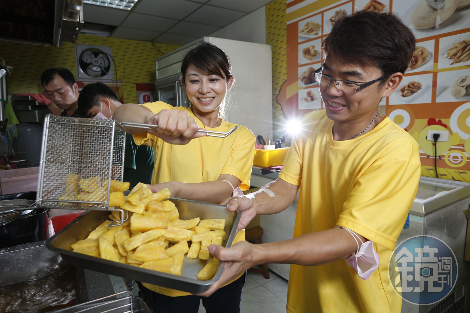 比宋耿郎小12歲的周善鈞原是百貨公司櫃姐,她甜笑:「我是近幾個月才辭去百貨公司工作,跟先生一起賣雞排,但朋友都說我瘋了。」過去她每天在冷氣房中打扮得光鮮亮麗,而今換成穿工作服、戴口罩,待在悶熱的油鍋前,截然不同的環境挑戰頗大,「但婆婆告訴我,夫妻還是應該合力經營事業,不要放給別人做,所以我最終選擇來顧攤子。」