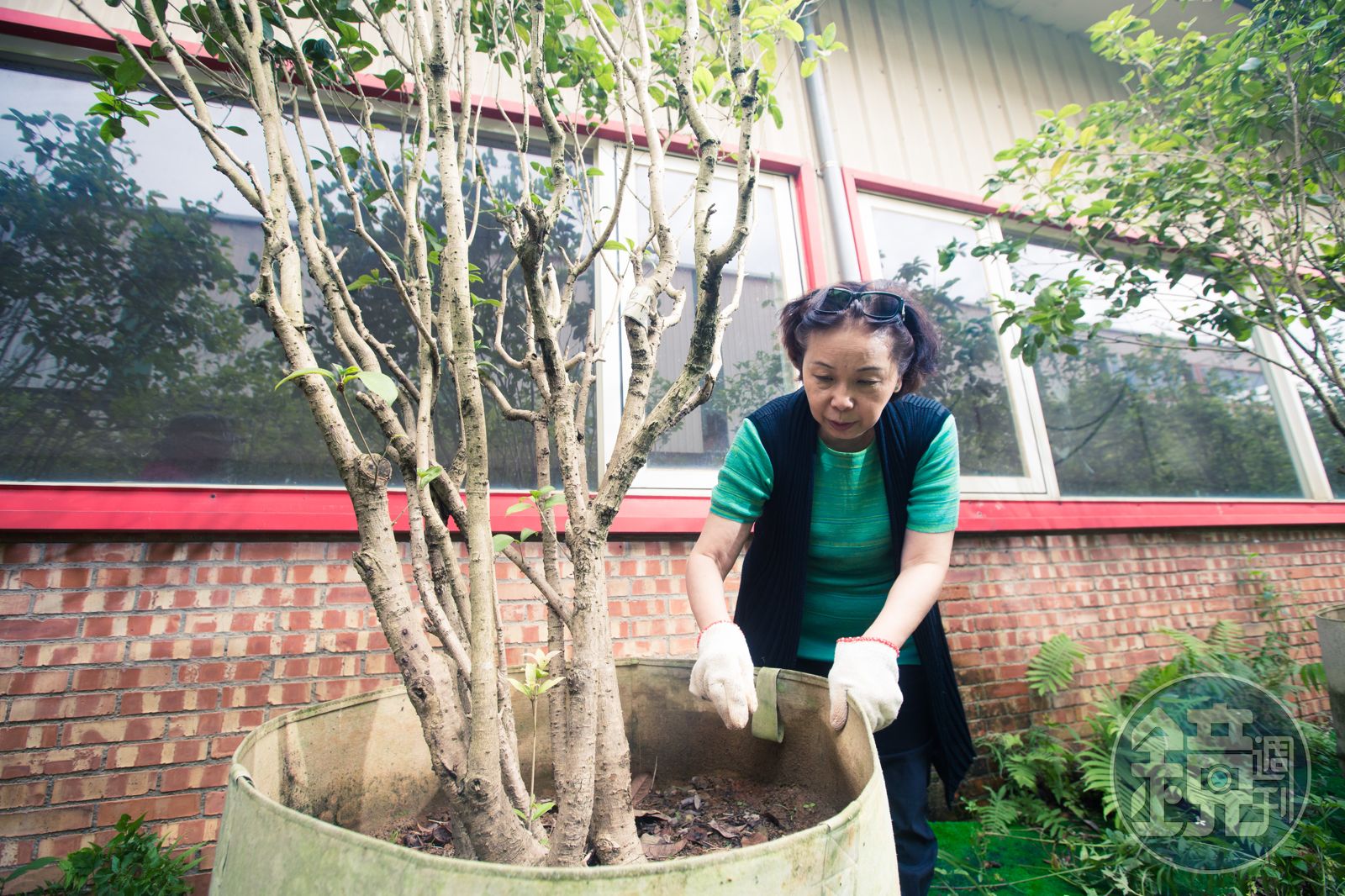 看到桂花樹,陳莉茵變成了老孩子,嚷著要看自己認養的第一號桂花樹,幾日大雨有泥濘,她也不管不顧膝蓋剛開過刀,找到後,發現桂花樹長得好,拿下眼鏡仰頭看樹梢,露出快樂的神情說:「齁,這是我用大兒子給我的紅包認養的捏。」說完戴上手套拔雜草,整理土壤。