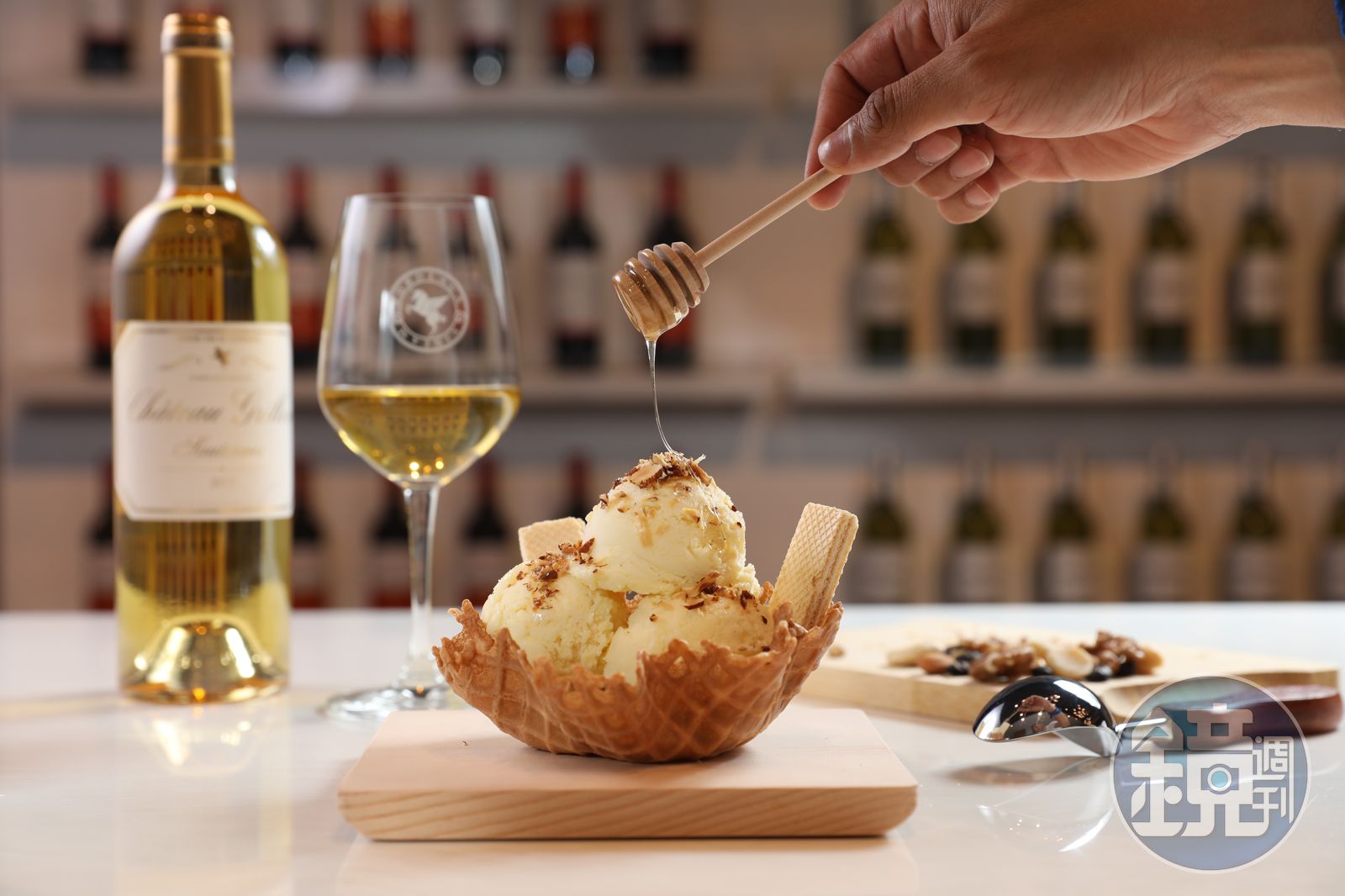 最簡單的葡萄酒冰淇淋,是把酒澆淋在冰淇淋上,看似簡單,味道搭配可是一 門學問,Emmanuel建議挑一支甜白酒,搭配香草冰淇淋。