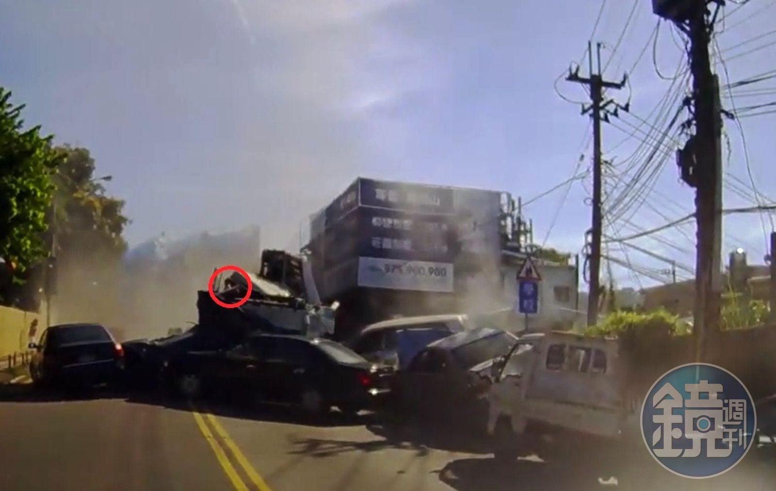 根據民眾提供的行車記錄器,警方發現江金水在距離車禍地點前500公尺處跳車逃生,但由於車速過快,他人一度「掛」在車門上,場面相當驚險,後來他奮力一跳,才順利與失控的水泥壓送車分開,逃過死劫。同車的陳姓女子當時來不及跳車,車禍後自行爬出變形的車體,向路旁民眾求救。