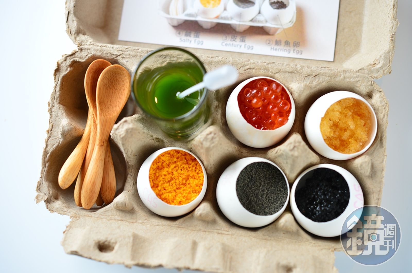 台灣小吃攤常見的「三色蒸蛋」,在Alain手裡,竟被拆解成有趣的味覺實驗,堪稱全場的重頭戲。炭黑橙黃的粉末,分別是烘乾的皮蛋和鹹蛋,再加上飛魚、鯡魚、鮭魚三種魚卵,五種蛋分別裝在蛋殼,還附一小盅翠綠蔥油與滴管,裝在紙製蛋盒裡上桌,想吃,得先自己動手。