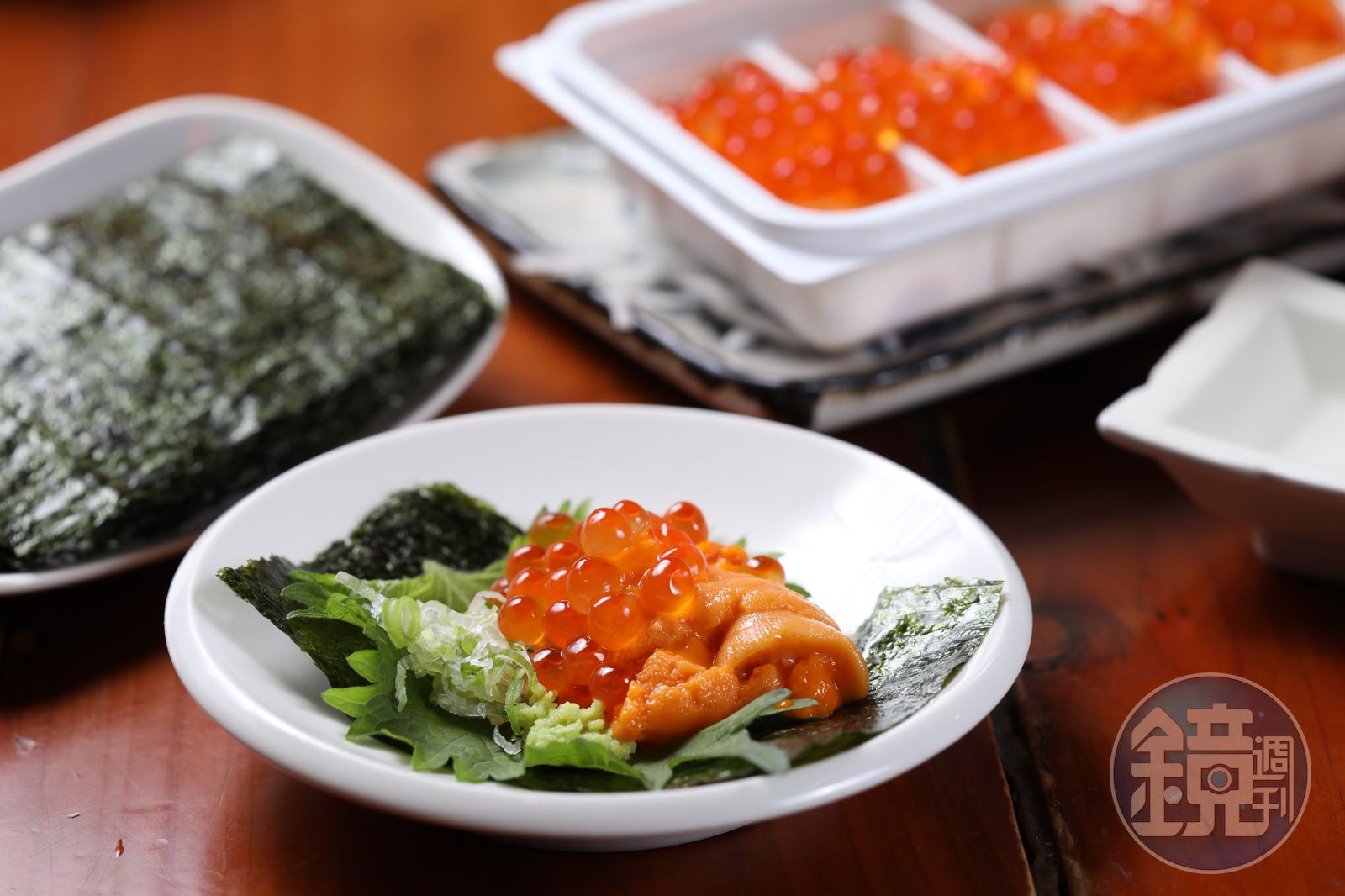 今年50歲的老闆江煒傑,15歲就到台北天母的日本料理店當學徒,自己開店25年,生活始終如一,早上備料、確認當天的食材品質,店裡許多招牌菜都來自他的創意,覺得海膽單吃很無趣,就附上鮭魚卵、紫蘇葉、海苔、青蔥一起上桌,既豪爽大器,又給客人自由發揮的空間。