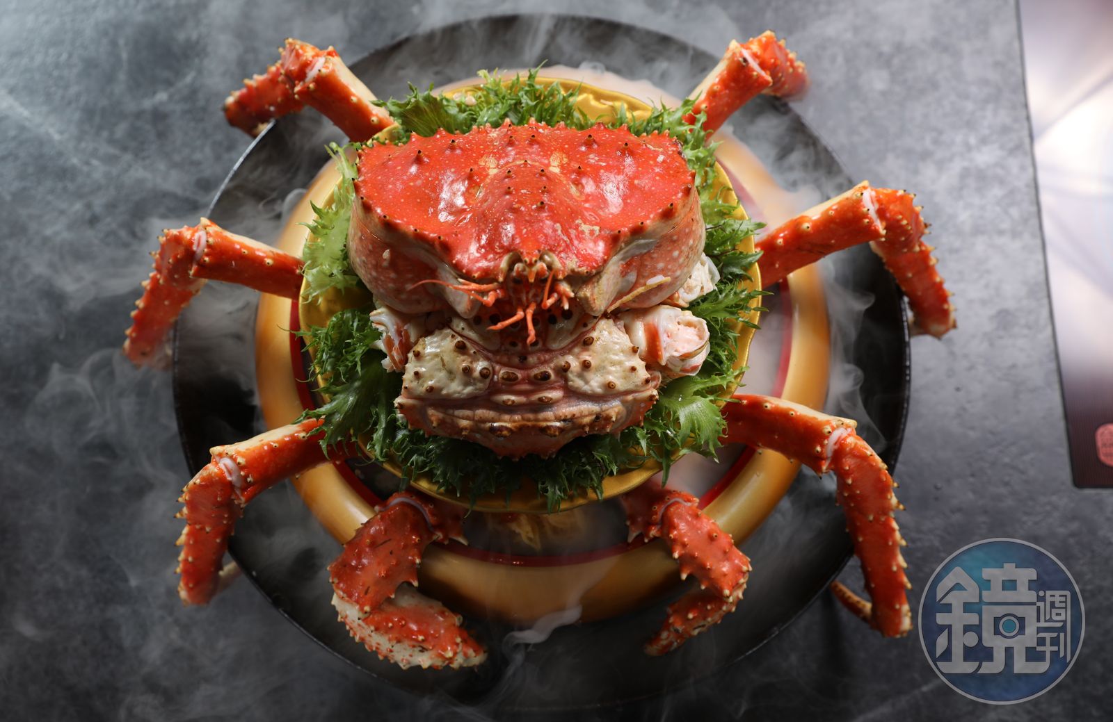 不過最驚人還是那一大碗「帝王蟹蓋飯」,雖然名為蓋飯,其實根本是巨型的散壽司,廚師將帝王蟹蒸煮冰鎮後取出蟹肉,放回盤中、蓋上蟹蓋,一隻帝王蟹便栩栩如生地趴在盤上,下層大碗裡,裝著用花蓮天禾米調製的醋飯、嫩口蛋絲與鹹香鮭魚卵,伴隨陣陣乾冰煙霧上桌,口感豐盛不說,視覺效果更是搶眼。如果不愛帝王蟹,還可換成松葉蟹,效果想必更驚人。