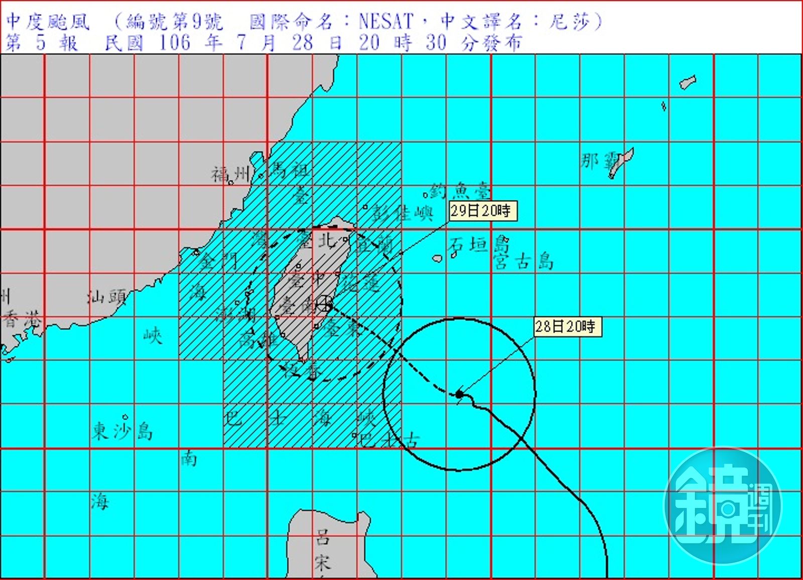 中央氣象局簡任技正伍婉華指出,尼莎經過溫暖的海域強度逐漸增強,今天晚上正式增強為中颱,未來路徑將會持續朝西北前進,截至今晚8時30分為止,暴風中心在花蓮東南方約410公里的海面上,以時速16公里計算,大約明天傍晚就有機會登陸台灣,首當其衝的東部必須嚴防強風豪雨。
