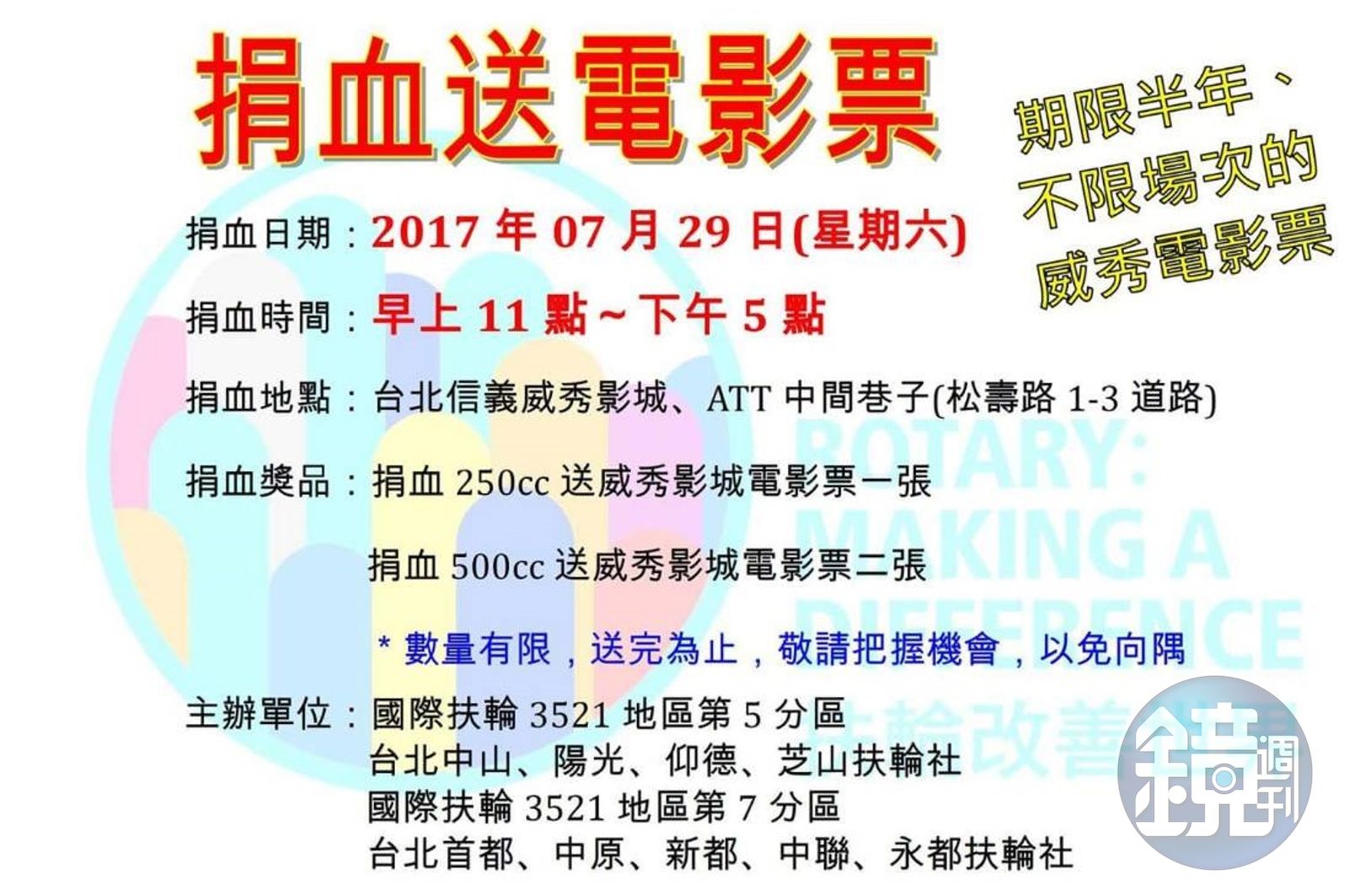 扶輪社表示,捐血250cc就送威秀影城電影票1張,500cc送2張,所有電影票都有半年的期限,且不限場次,歡迎民眾踴躍到現場捐血。 扶輪社提醒,捐血時必須攜帶有身分證字號及照片、足以證明身分的證件;年齡須滿17歲、不超過65歲;男生需超過50公斤、女生45公斤。 這次的愛心捐血活動,是由國際扶輪3521地區第5分區的台北中山、陽光、仰德、芝山扶輪社,及國際扶輪3521地區第7分區的台北首都、中原、新都、中聯、永都扶輪社,共同主辦。
