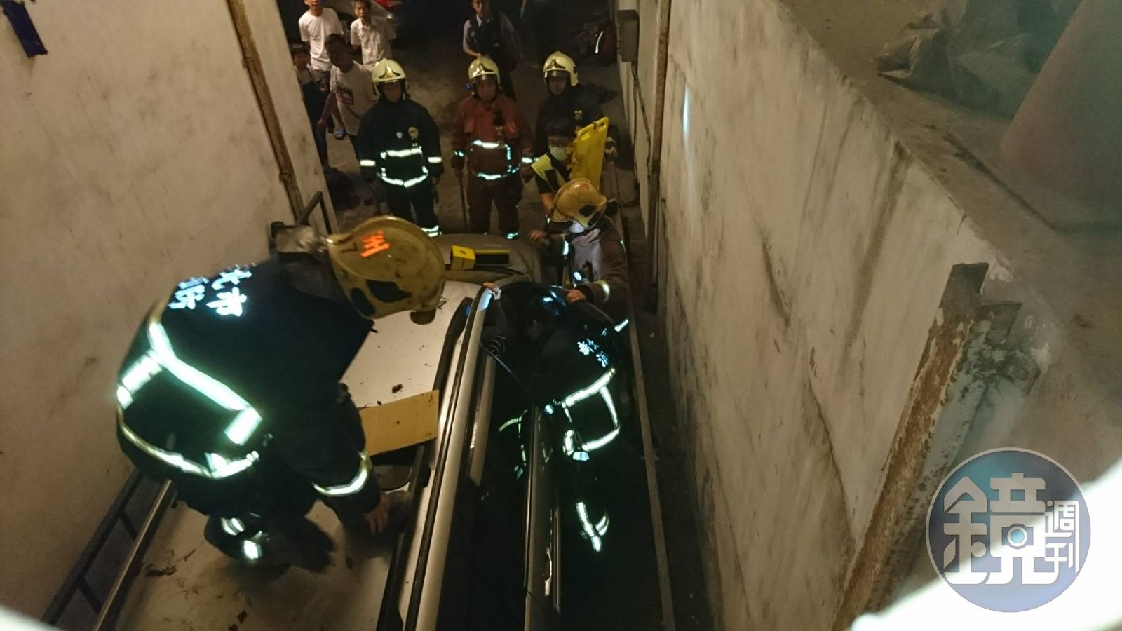 車上4人飽受驚嚇,聽聞巨響的鄰居原以為是颱風天招牌遭吹落,察看後才發現有車子摔到地下1樓,連忙通報警消處理。