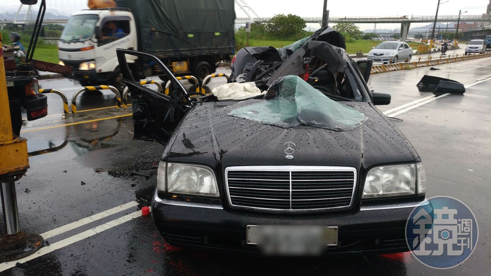 今日下午2時許,顏男駕駛賓士車載著吳姓女同事行經新莊重新堤外道,靠近新月橋時,賓士車疑似因大雨打滑,賓士車先是在原車道打轉,後又滑行到對向車道,僥倖閃過正面行駛的大型貨車,卻閃不過經過的大型機吊車,64歲的機吊車駕駛王男剎車不及,2車發生嚴重擦撞。