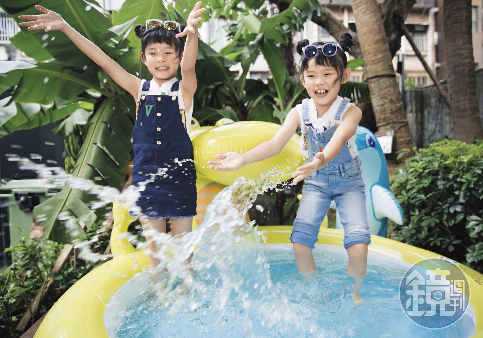 吃飽之後,左左右右又充滿了活力,餐廳有很大的庭園,足以讓好動的她們奔跑。晴朗的夏天,左左右右看到餐廳準備的小小戲水池就瘋了,不過因為宣傳服不能弄濕,只能用腳泡在水裡,難為了好動的她們。