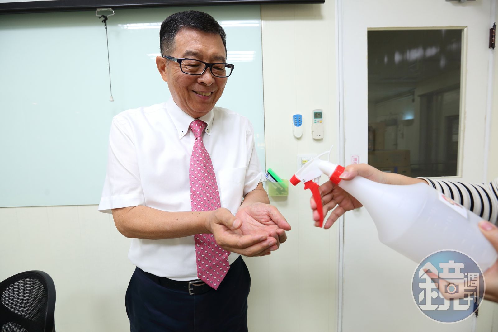經同事這麼一說,他顯得有些害羞,拿了酒精又噴了噴手,同事也趕緊轉移話題,「董事長常說保持手部清潔很重要,因為大部分細菌都從手而來。習慣使然,他比我們這些年輕人還不常生病,就連感冒都很少。」