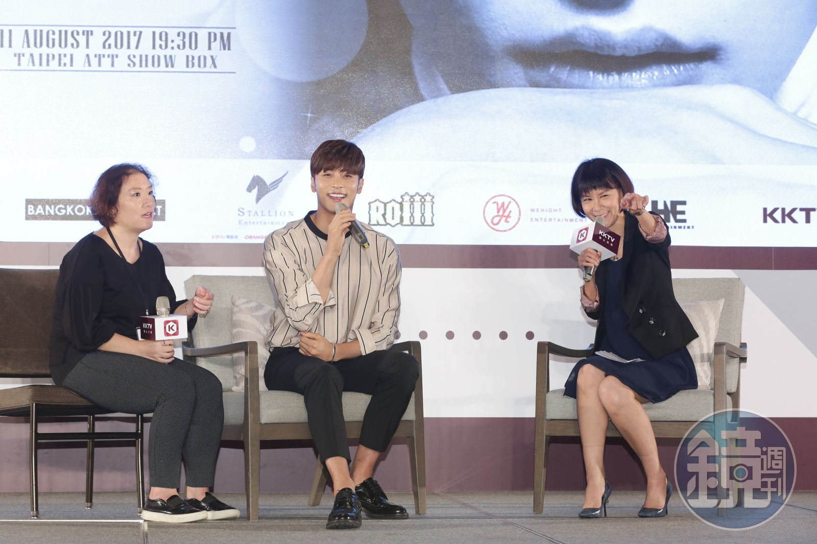 成勛一登台,就連中間電視牆上原本顯示「KKTV難以抗劇」的畫面,也更換為成勛明(8月11日)日的粉絲見面會海報,連手上拿的麥克風也沒有KKTV立牌,明顯與主持人阿娟及翻譯不同。