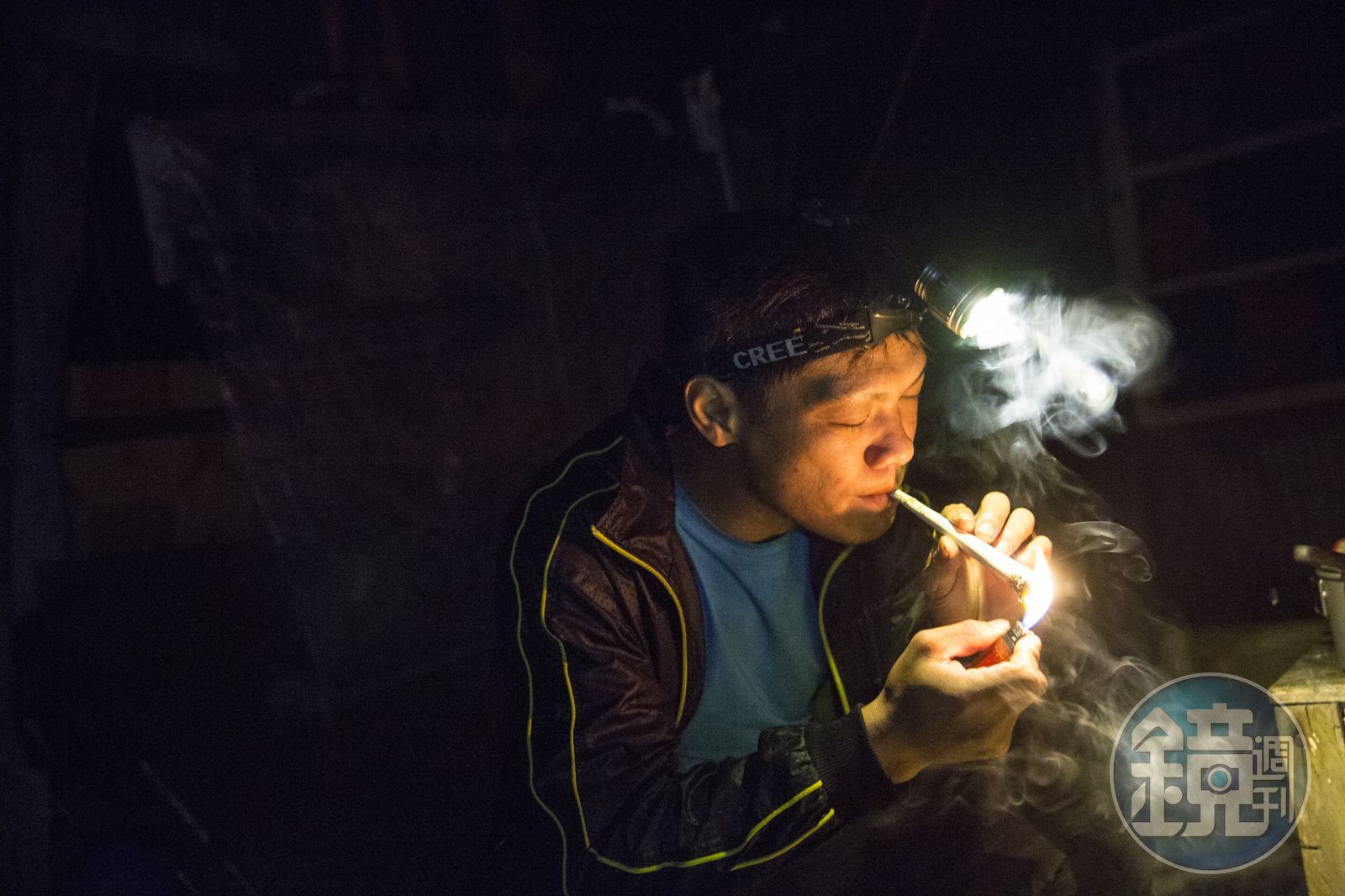 老菸槍手不抖了,我接過那支菸,不知道是山上空氣好還是菸就這樣,味道很像,只是非常嗆,抽過的人會一直咳嗽。山上沒事做,我們撕筆記本來捲菸。