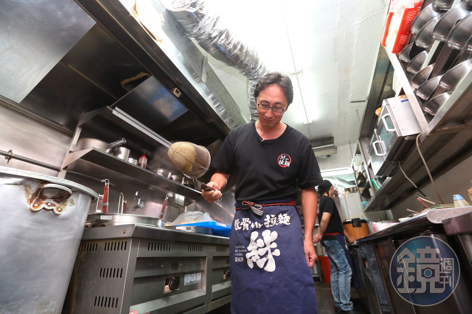 「拉麵的醬料配方,是依據我在日本吃到的口味,再請原本是廚師的店長調整,建立一套SOP。」採訪當天,Mr.拉麵廚房裡有一鍋湯正用小火慢慢加熱,卻看不到豚骨,野岐孝男解釋說:「我們店頭比較小,因此各店湯頭統一外包給屏東的中央工廠熬煮,麵條、半熟蛋也是外包給食品廠製作。」