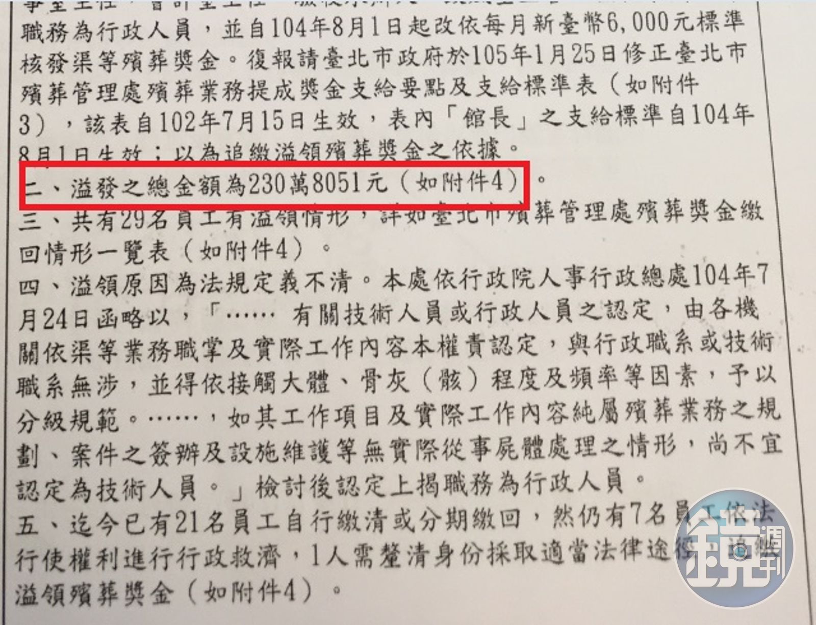 而本刊也取得一份台北市殯葬處溢領殯葬獎金的報告,內容載明多年來殯葬處溢領金額達新台幣230多萬元。按照各地方政府請領殯葬獎金的規定,必須是以「第一線碰觸大體人員」為請領對象,每個月可核發6,000元至3萬元的殯葬獎金。但坐在辦公室的高階主管,如館長等非第一線工作人員,居然也可請領,明顯自肥。而審計處知情後,也要求台北市殯葬處繳回溢領的殯葬獎金。