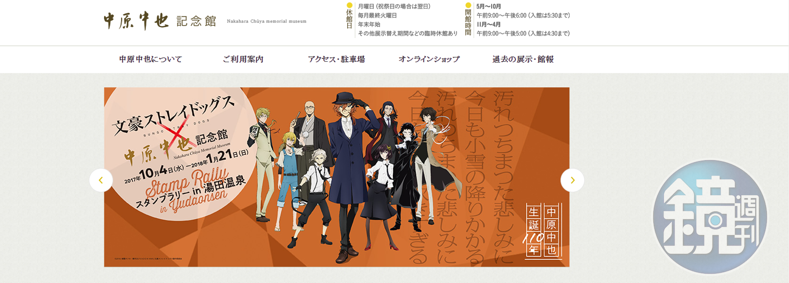 《文豪野犬》的集紀念章活動,從 10 月 4 日到明年 1 月 21 日止,活動地點特別選在作中主角之一「中原中也」的真人故鄉,山口縣山口市湯田溫泉舉辦,整場活動也以中原中也為主角。
