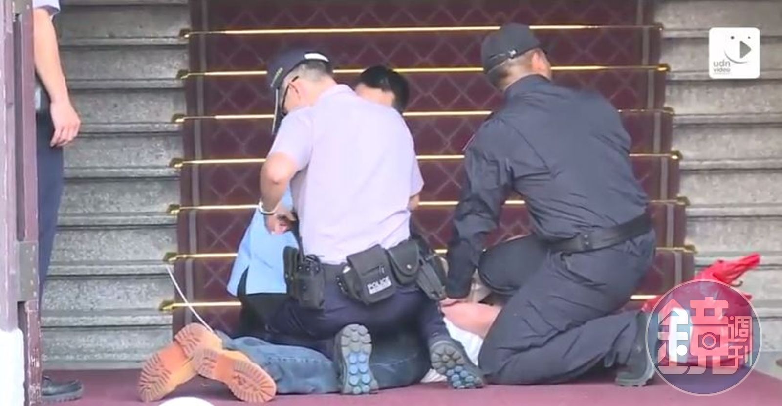 根據中正一分局初步偵訊結果,這名55年次的男子呂軍億,家住北投,無業,也沒前科,在上午10點10分先拿榔頭破壞軍史館展示櫃,取得1把展示用的武士刀,5分鐘後,前往總統府西大門欲強行進入,故與持槍的周姓二兵發生扭打,才會造成周員右頸、左耳及雙手多處遭劃傷,無生命危險,呂嫌現由中正一分局派員偵訊中,警方從呂男背包中的五星旗判斷,不排除呂男硬闖總統府是為了彰顯個人政治立場。