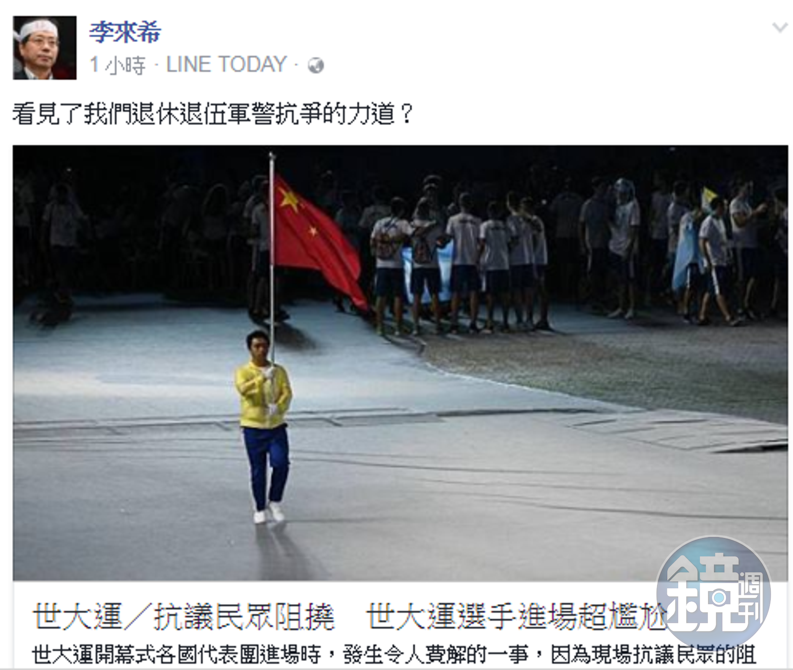 李來希下午受訪時表示,「醜媳婦總要見公婆,要妳(蔡英文)真實面目面對國際社會。」 李來希說,國際社會開大型會議不缺抗議場面,香港2005年WTO部長級會議,有2,000個韓國農民、世界各國勞工到場抗議,西雅圖國際會談也這樣,有誰罵他們,最後是罵WTO部長級會議做了什麼好事;而民眾也會檢驗蔡英文做的什麼好事,「你看我們這麼溫和啊!有什麼事?」 李來希稍後受訪又說,開幕式有什麼了不起,又沒有影響賽事,反年改這些人的問題需要解決,抗議會沒完沒了,接下來還有閉幕式。