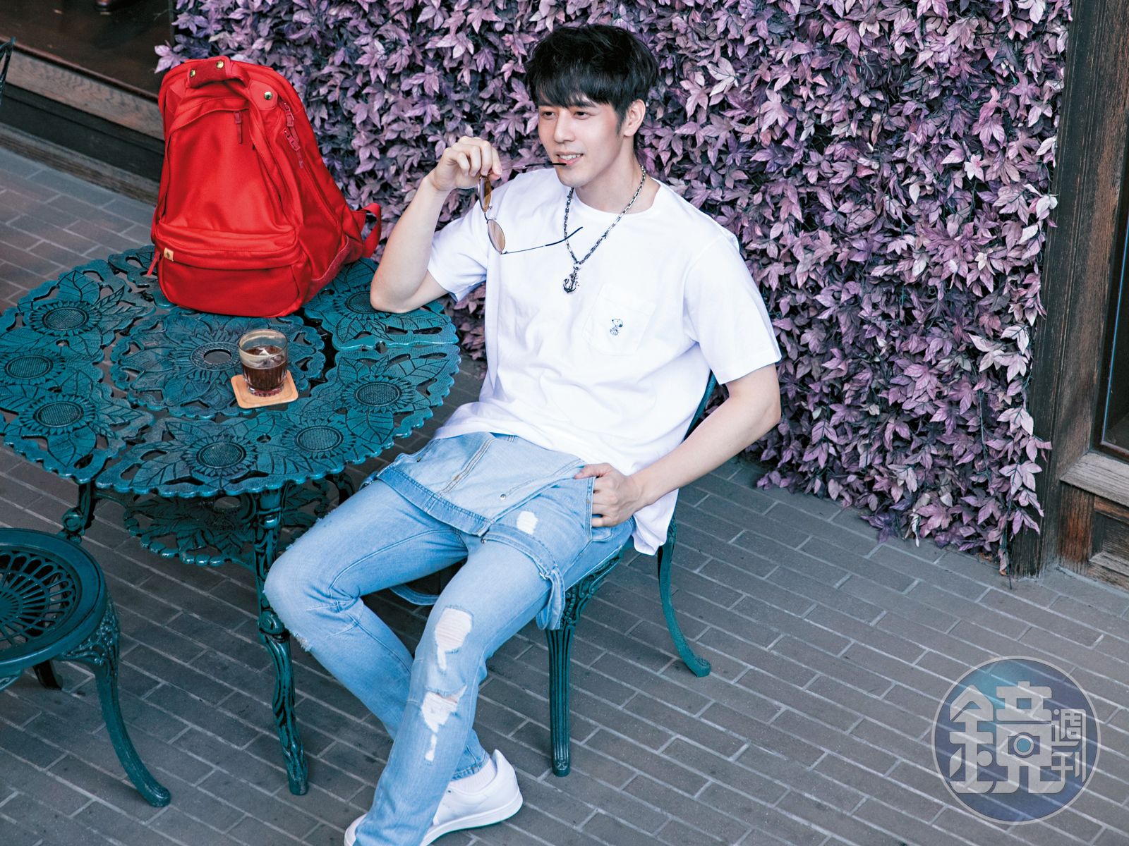 這一套服裝的搭配方式,就是我平常會走在街上的打扮喔!私底下的我很喜歡穿著T-Shirt、牛仔褲或是吊帶褲,不用想太多就可以立刻出門;我的打扮一向都很簡單,也不會有太多或是過於累贅的飾品,就是以輕鬆、舒服的休閒概念為主。