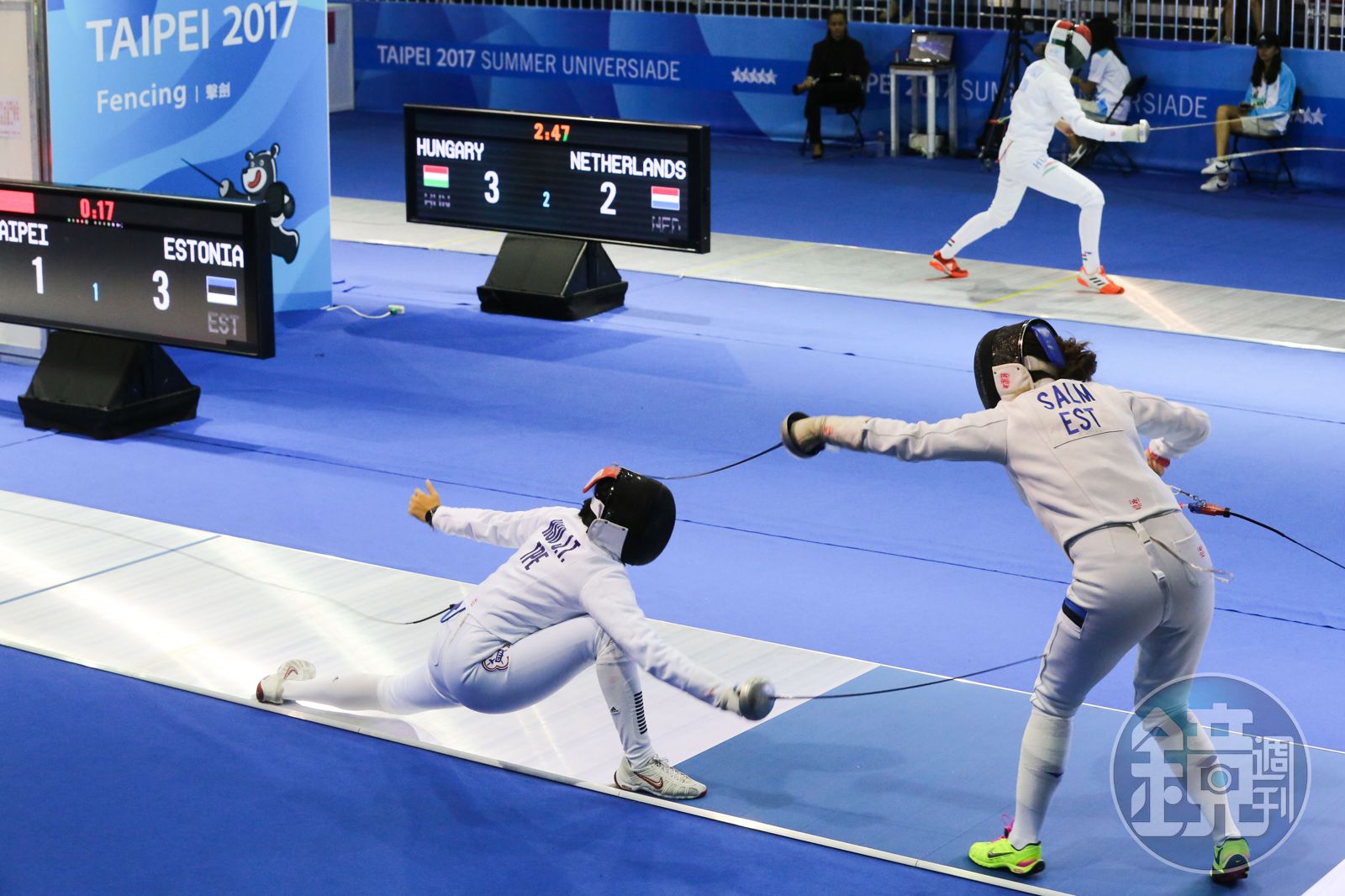 23日上午,世大運女子銳劍團體項目在南港展覽館1樓舉行16晉級8強資格賽,中華台北女子擊劍隊派出徐若庭、林卉旻、鄭雅芳、邱芷婷輪番上陣,最終團體成績以37:36,一分差距敗給愛沙尼亞隊。