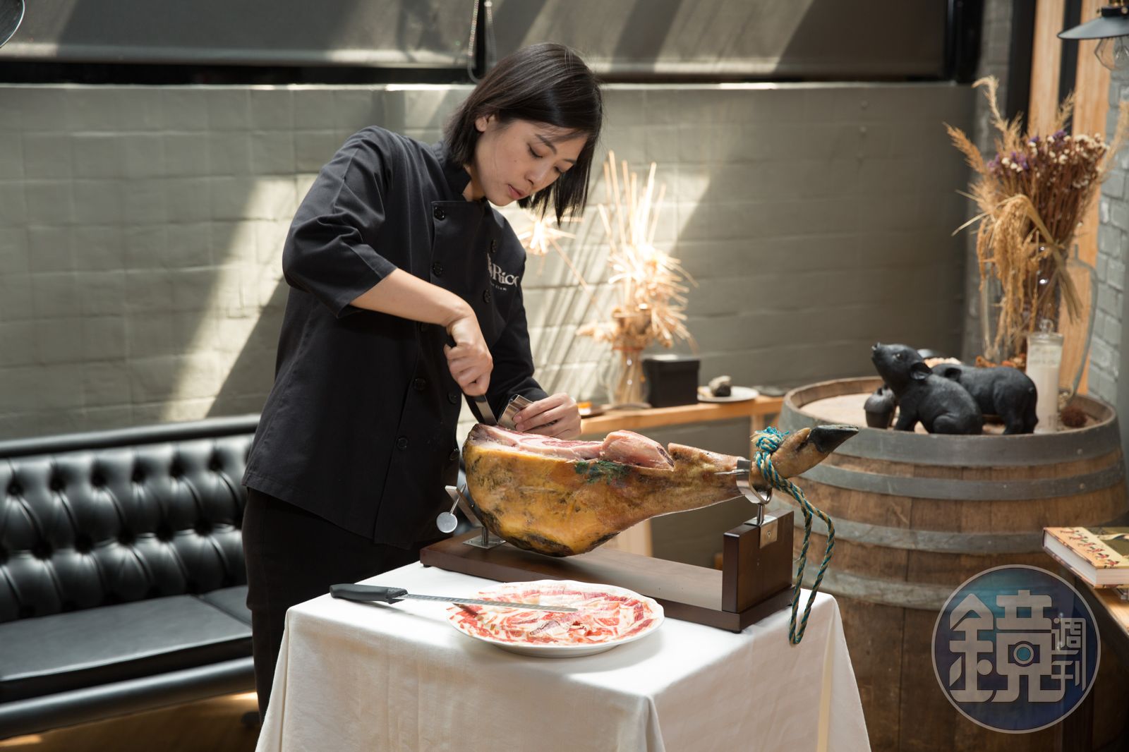 我很好奇,推廣伊比利火腿有很多種方法,為何要選一條相對辛苦的路?「雖然想推廣不一定要自己下場切,但我覺得這是一個態度,侍肉師是傳遞的角色,告訴大家火腿的文化,我能用這個角色說這件事,還蠻光榮的。在服務過程中,看見客人從『吃到』到『知道』,是很有成就感的。」酷酷的她揚起一抹微笑接著說:「各行各業都可以是個咖,只要夠專業,有何不可?屠夫又如何,我也是個專業的咖。」