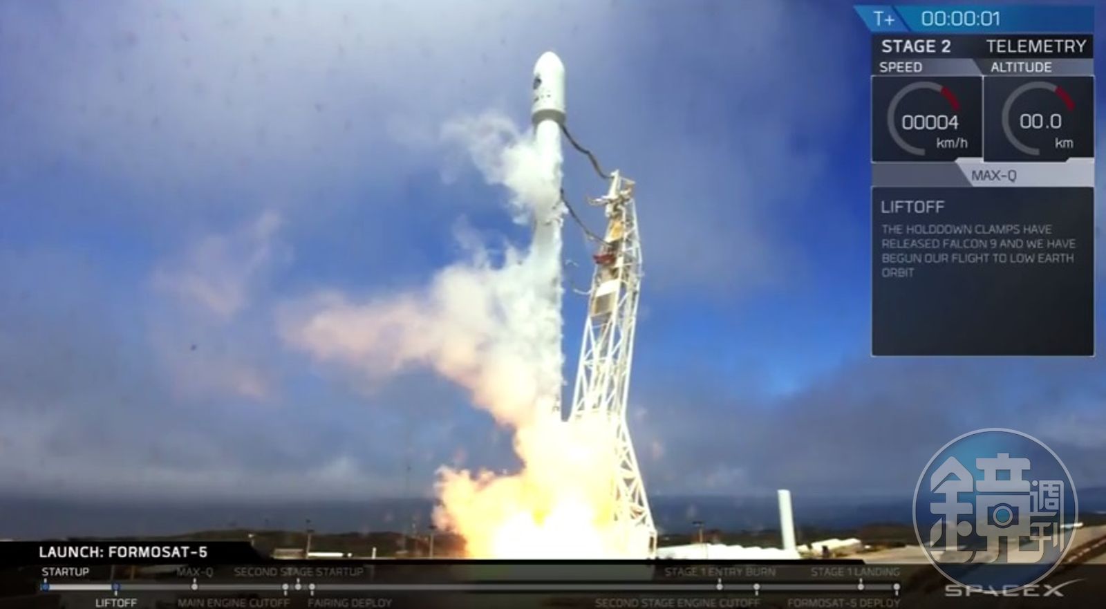 全名「福爾摩沙衛星五號」上個月搭乘華航貨機前往加州後,經過1個月的系統整合測試,今天凌晨終於搭著獵鷹九號成功飛上太空,火箭發射後2分35秒第1節火箭脫離,當時的高度是90公里;2分59秒保護衛星的鼻錐罩脫離,衛星開始現身並與火箭飛行;11分19秒時衛星成功與火箭脫離,正式進入723公里的軌道,未來經過軌道校正後,將會在720公里的軌道上服役。