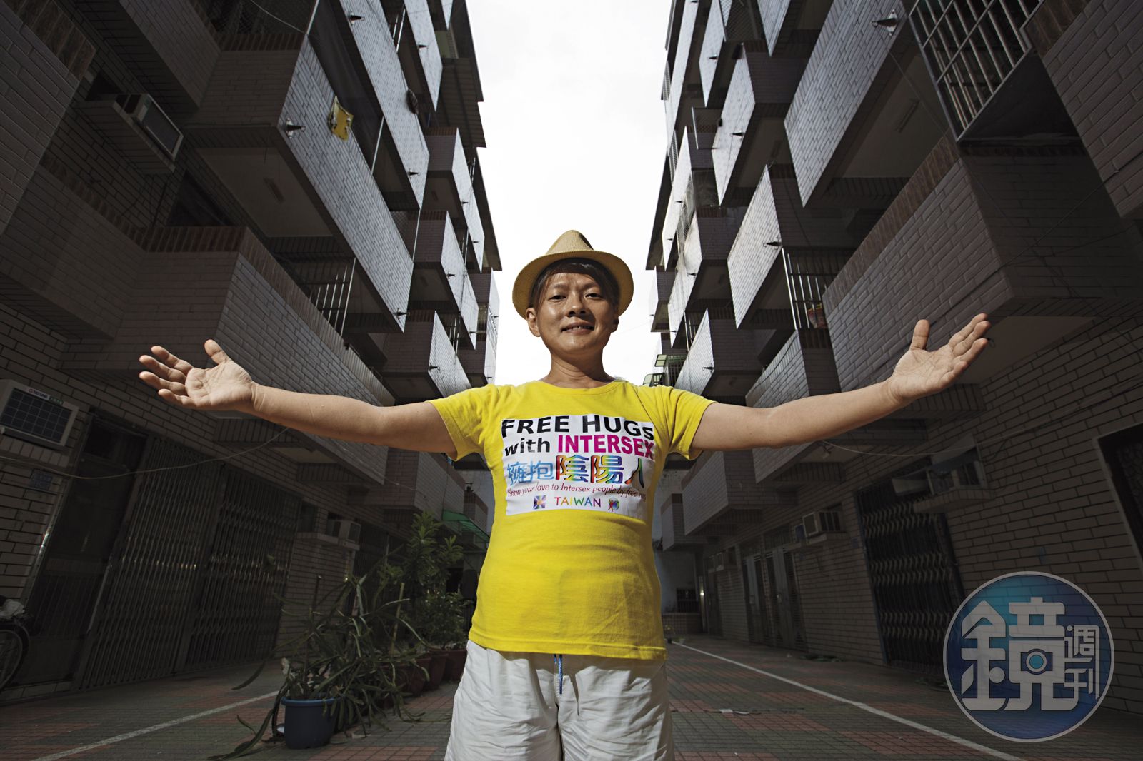 他目前在樹德科大人類性學研究所攻讀博士,一個人住在學校附近。採訪這天,他特地換上有標語的T恤,上頭寫著:「擁抱陰陽人。」9年來,身為國際陰陽人網站中文版創辦人的他,持續為陰陽人發聲,在各種同志運動中舉牌,要讓社會知道,陰陽人也是人,也是一種性別,不是怪物。