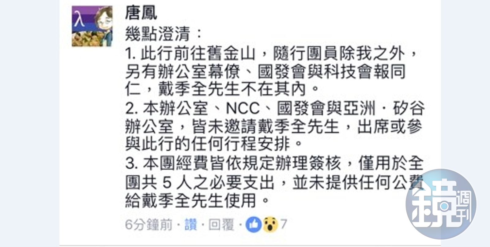 另外,唐鳳辦公室、NCC、國發會與亞洲・矽谷辦公室,皆未邀請戴季全先生,出席或參與此行的任何行程安排。這次出訪團的經費皆依規定辦理簽核,僅用於全團共5人之必要支出,並未提供任何公費給戴季全先生使用。