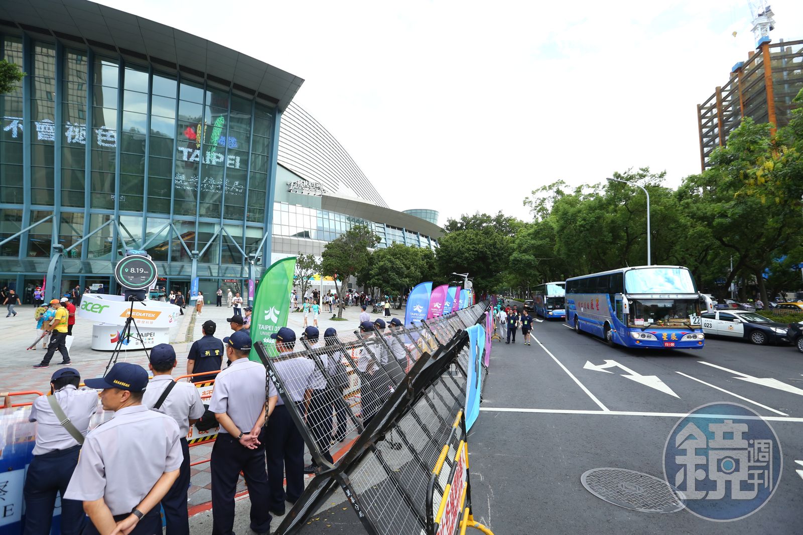 為讓世大運閉幕式順利進行,警方維安檢查不敢鬆懈。讀者提供該名警官指出,警方在數天前就開始在場外部屬人力,再加上多層拒馬防護,有絕對的把握能阻擋企圖鬧場的人士。