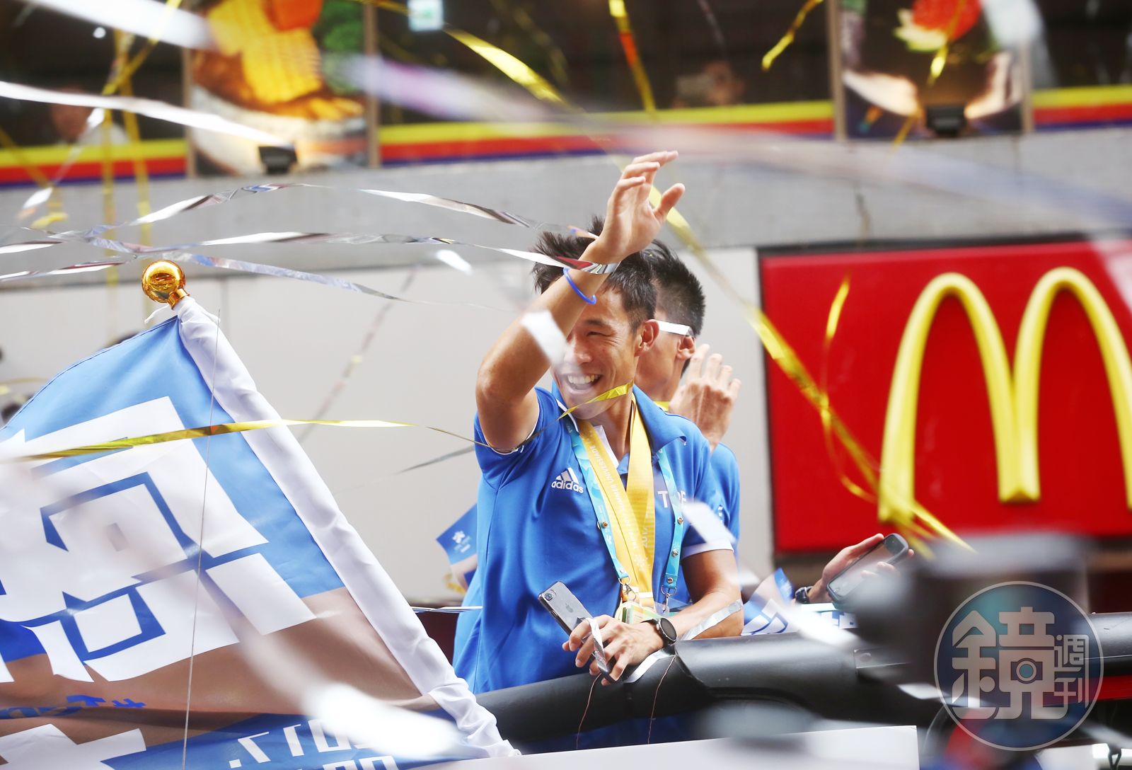 在世大運英雄遊行現場,滿滿的支持人潮占據馬路兩邊,選手們從車上看到此番熱情景象感動不已,個個臉上流露出燦爛笑容。
