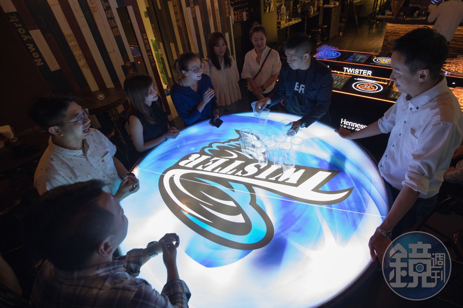 一旁進階版的SLAP CUP(彈球杯)更嗨了,大夥接力將乒乓球彈至球杯,進球的話就傳給下一位,失手就會被蓋杯並罰酒,最後的輸家則要買單,一個個玩家頂著紅漲的臉,心跳隨著酒精濃度加速,連圍觀者也忍不住手癢了起來。
