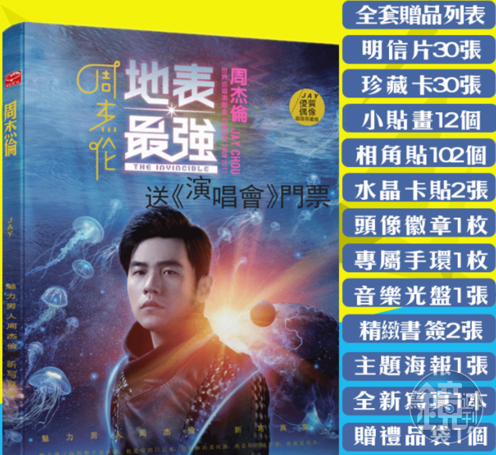 周杰倫的寫真集贈品更驚人,不但送專輯CD,連一票難求的「地表最強」台北演唱會門票都被當成贈品。2人的寫真集都開價新台幣1,099元,看起來是佛心價,但其實所有照片都是侵權而來。