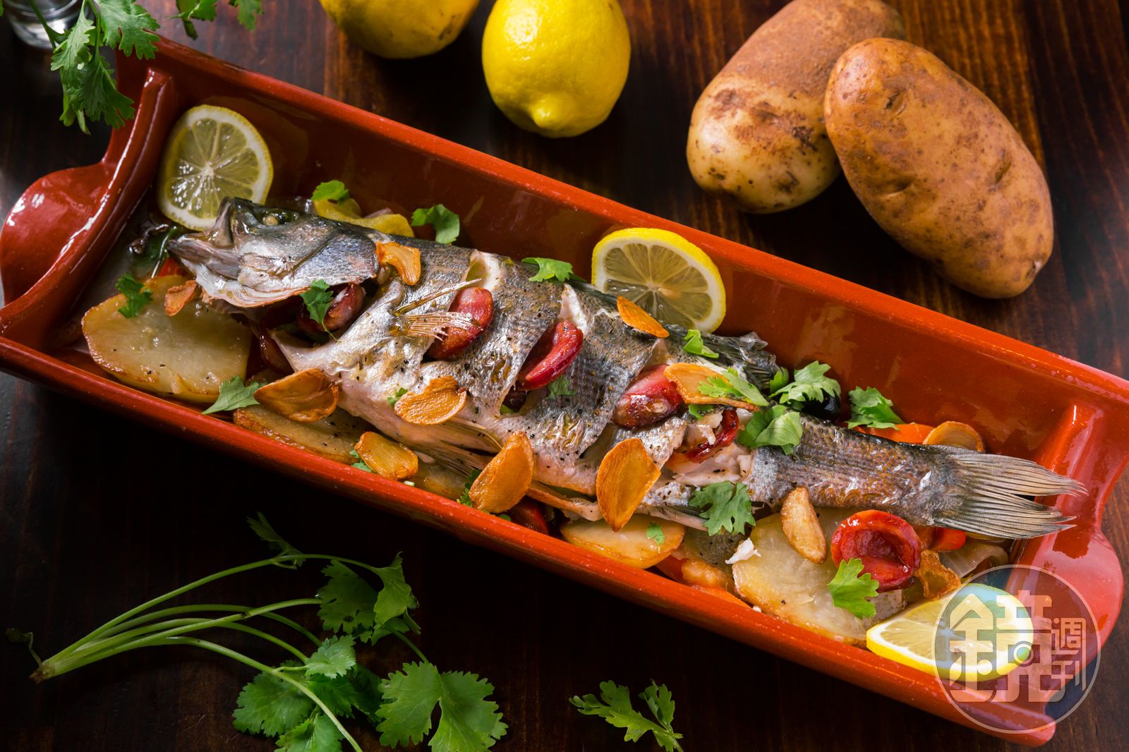 曾被葡萄牙人占領的澳門,飲食文化深受其影響,澳門土生葡人家庭聚會常出現的大菜「葡式燒焗鱸魚」,就是一道經典葡國菜。「我將蘆筍塞在鱸魚裡,表皮劃刀擺進葡式香腸,淋點白酒、檸檬汁後進烤箱,上菜前撒些橄欖油增加油潤感。」Gilbert解釋。味道略鹹的葡腸,帶出鱸魚的甘美,盤底的馬鈴薯片吸飽了肉味、菜甜、酒香,味道最是精彩。
