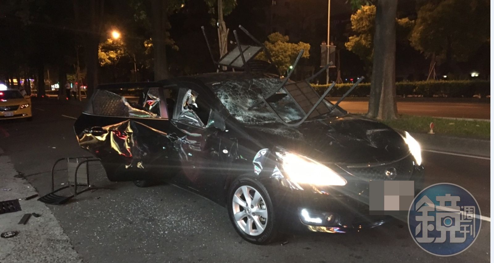 4名酒客與賴女在酒店門口拉拉扯扯,謝姓經紀人見自家小姐無法脫身,趕緊衝上前護花,此舉讓4名酒客更加抓狂,於是抄起附近便利超商的椅子,朝謝男車子猛砸,對方來勢洶洶,謝男根本不敢靠近,等酒客揚長而去,車子玻璃全被砸破,車身多處凹陷,滿目瘡痍。
