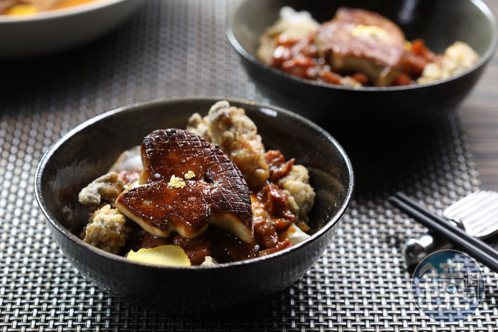一道「鴨肝蚵仔酥滷肉飯」,他取豬前腿皮與後頸肉做滷肉,「一般用的肉臊以五花肉居多,我用帶筋帶油的松坂(後頸)肉,可以保持形狀,也不會柴。」滷汁則以豚骨白湯為底,結合黑豆醬油和自然發酵的無糖醬油調成,膠質滿點更能扒住白飯。「重點是現磨的白胡椒粉,能夠提昇滷肉飯的香氣。」光這樣還不夠,他搬出蚵仔酥來提鮮,又煎了肥鴨肝,讓甜腴的口感補了層次,最後擱上一顆半熟蛋,噴香滷汁與蛋汁流淌,根本犯罪!