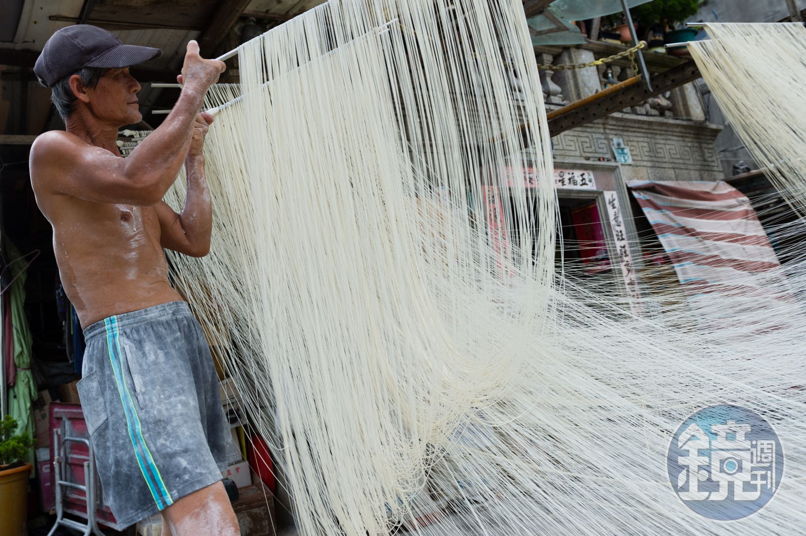 雖然時間緊迫,但是有禮貌的跟阿伯表明想拍照還是必要的攝影禮儀喔!阿伯說你要拍很歡迎,但是不要打擾到他工作的動線就好。一身精壯的阿伯動作俐落地把麵線甩得波浪翻飛。