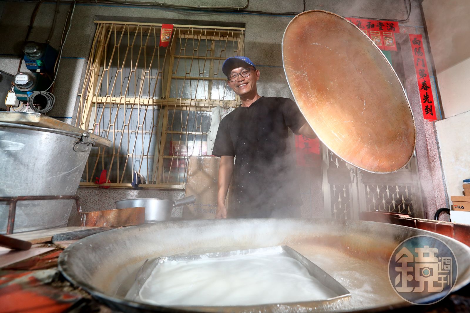 滾燙大灶冒著陣陣白煙,佳冬阿志粄條負責人蕭凱嶸動作俐落,舀起一勺用生、熟在來米漿按祖傳比例調製而成的粄漿,倒入不銹鋼盤,輕輕搖晃盤身,使粄漿均勻分布,接著連盤放入大鍋,2分鐘一到,顧不得蒸騰熱氣使眼鏡全起了霧,蕭凱嶸徒手拿起滾燙盤子,趁熱刮下客語稱「面帕粄」的粄條,全程如練鐵砂掌。