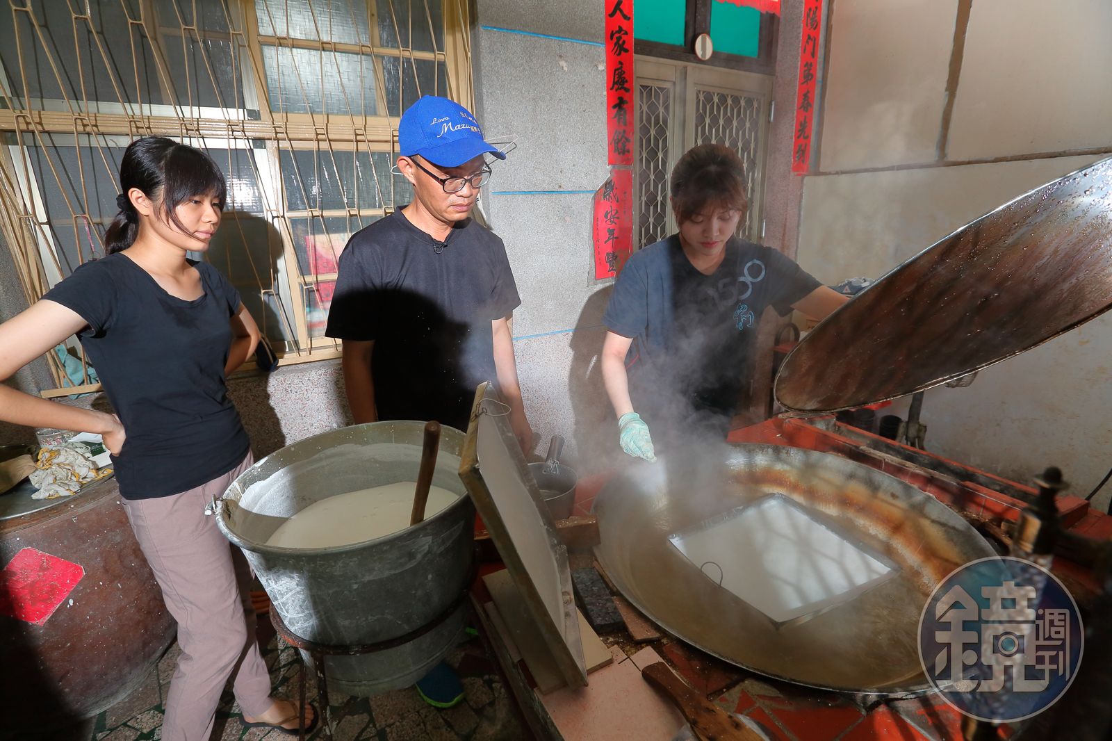 終究是團結的一家人,為了讓父親喘口氣,蕭羽晏與蕭宇芸二話不說輪流戴起雙層手套,從蕭凱嶸手上接過調好的粄漿,舀了一勺,倒入不銹鋼盤,輕輕搖晃盤身,使粄漿均勻分布,接著連盤放入大鍋,動作利索地製作手工粄條。一樣省話的蕭凱嶸雖然沒多說什麼,欣慰神情全寫在臉上。