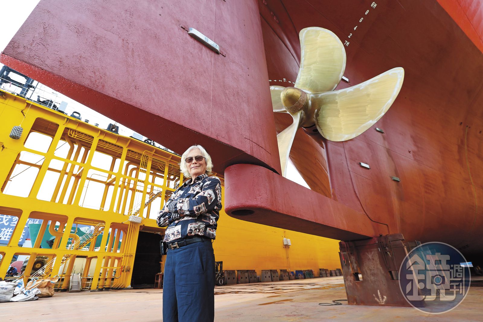 高雄旗津的夏日海邊悶得令人發昏,75歲的韓碧祥,頂著一頭酷似香奈兒創意總監卡爾拉格斐(Karl Lagerfeld)的飄逸白髮,快步走在8層樓高、可維修各式大型船艦的中信八號浮塢旁:「這裡5個造船廠,都是我的。」