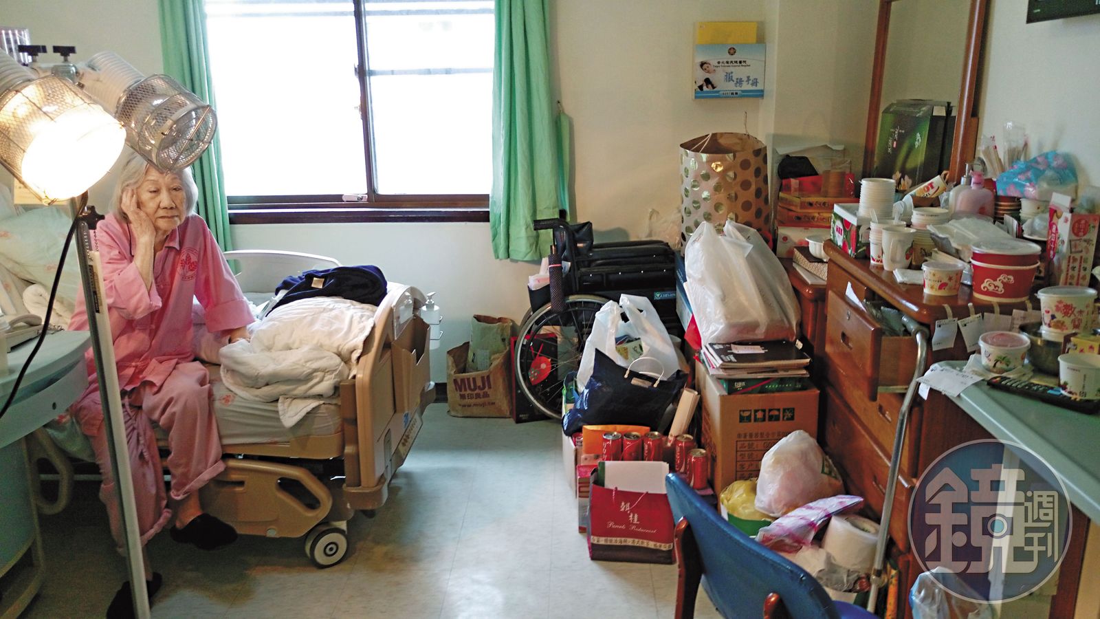 本刊直擊老奶奶住的單人病房,簡直成了私人套房,四處堆放生活起居各項用品,廁所打掃得相當乾淨,盥洗用具一應俱全,床邊的大窗戶可以遠眺山景,床邊還有一組暖爐燈,她說,天冷時就開2顆燈,現在夏天,只開1個,牆上則裝有液晶電視,隨時可以收看有線電視,月前記者來採訪老奶奶時還見過整箱的可口可樂,看起來老奶奶住在北榮生活非常愜意,這也難怪老奶奶賴著不走。