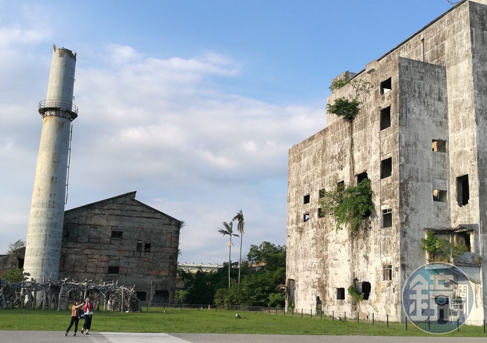 園區腹地十分大,部分荒廢頹圮的水泥建築保留原貌,從老建築窗口長出綠樹,班駁的牆身,一旁還有直聳入天卻留有毀損痕跡的大煙囪,眼前的景象形塑出另一種頹圮的美感。