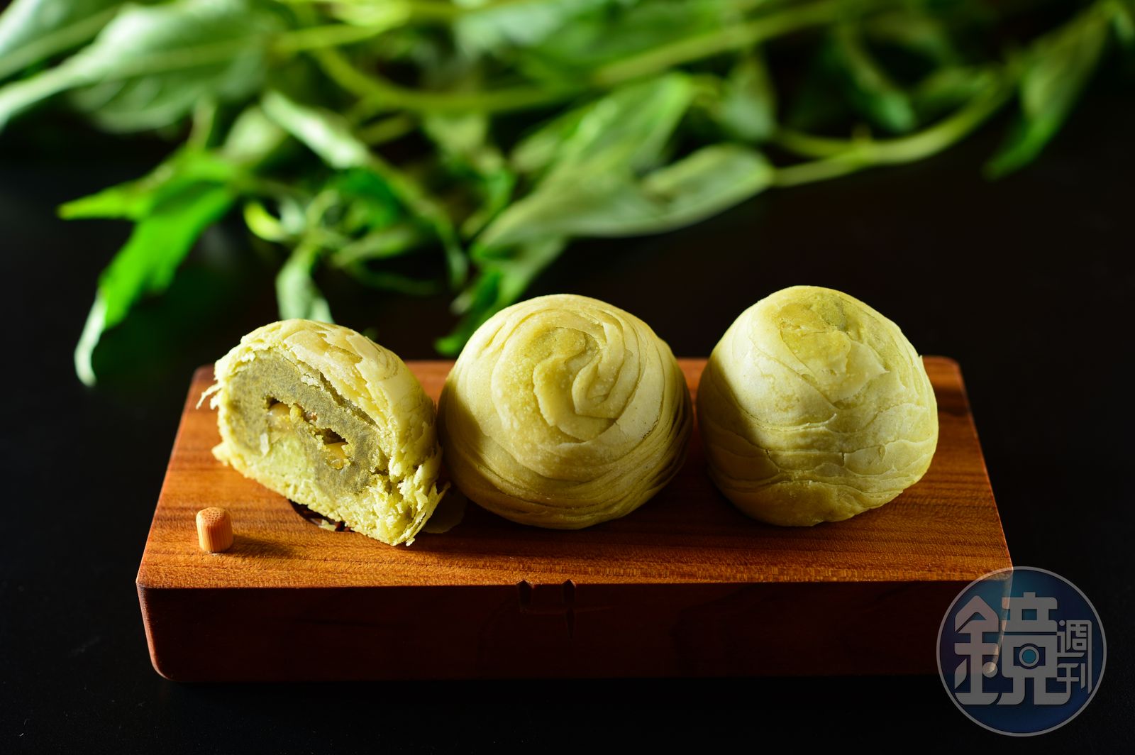 很有實驗精神的陳富美就是把這樣當地特有的麻芛磨成粉入餅,為了要烤出綠色的層次,麻芛粉得分別加入油皮、酥皮,經由揉擀、捲起等多次的動作,最後包入松子後整形,以170度烤40分鐘,才能完成圓嘟酥香且多層次的「麻芛松子酥」,還讓松子酥多了淡雅青綠色,滋味帶有清新草香。
