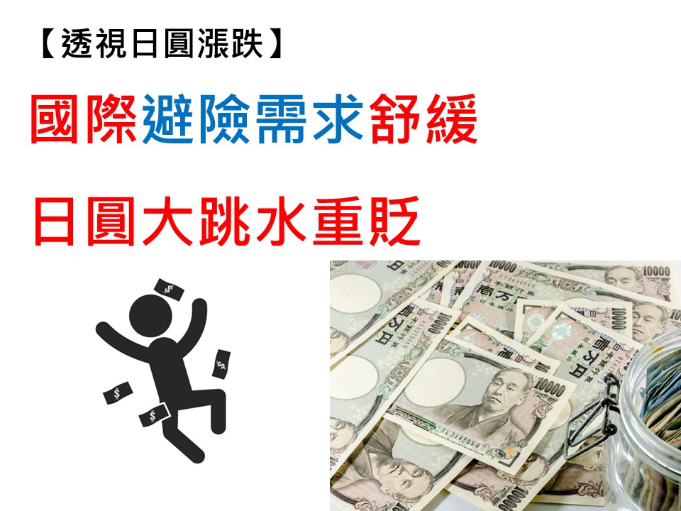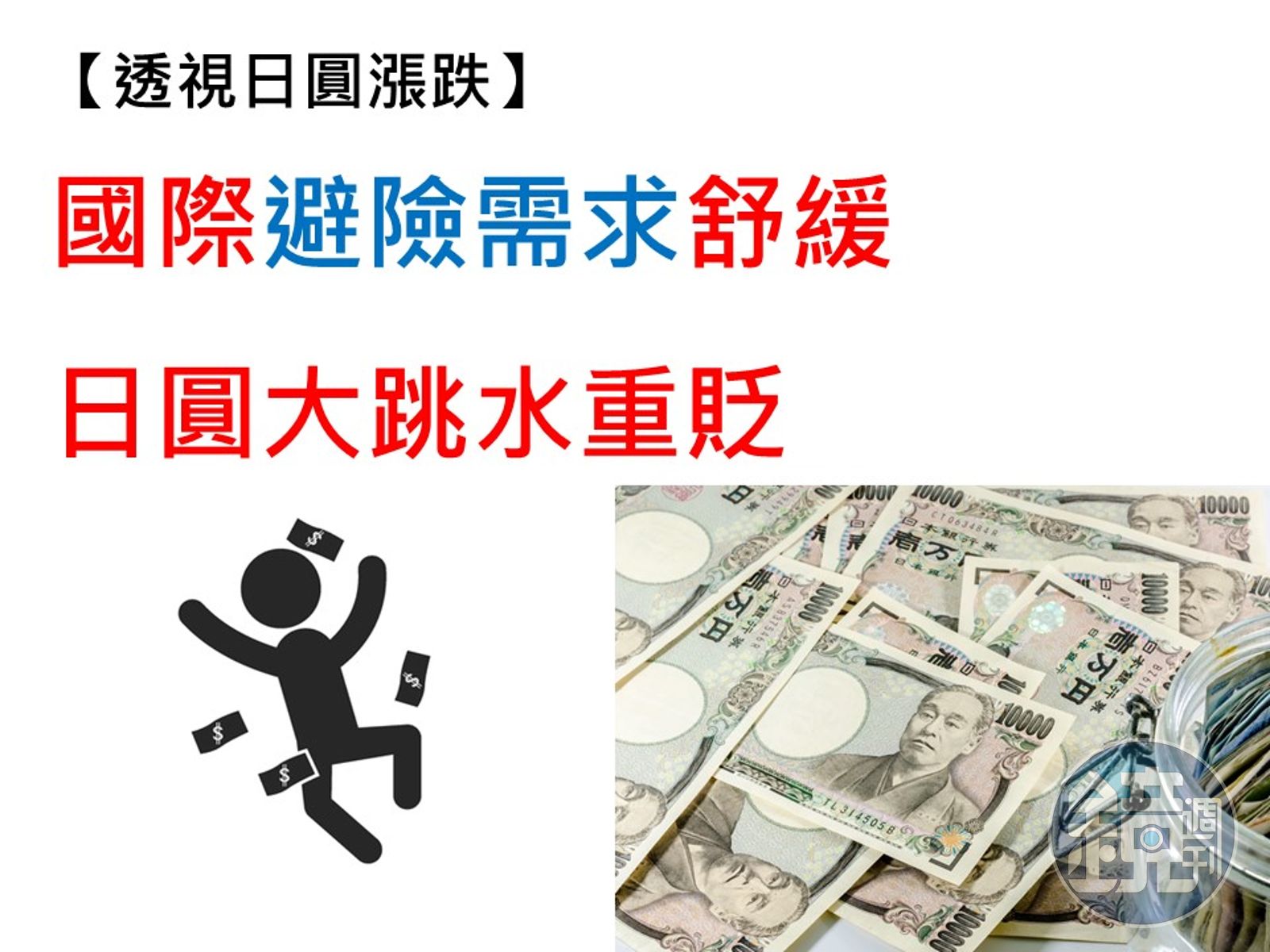 由於日圓不容易受到政治、戰爭等因素干擾,因此當國際風險升高時,各大資產恐慌拋售,紛紛換成日圓,造成日圓上漲。反之,當全球風平浪靜時,投資者又會將手上日圓賣回去,換成原本資產進行投資,造成日圓回貶。