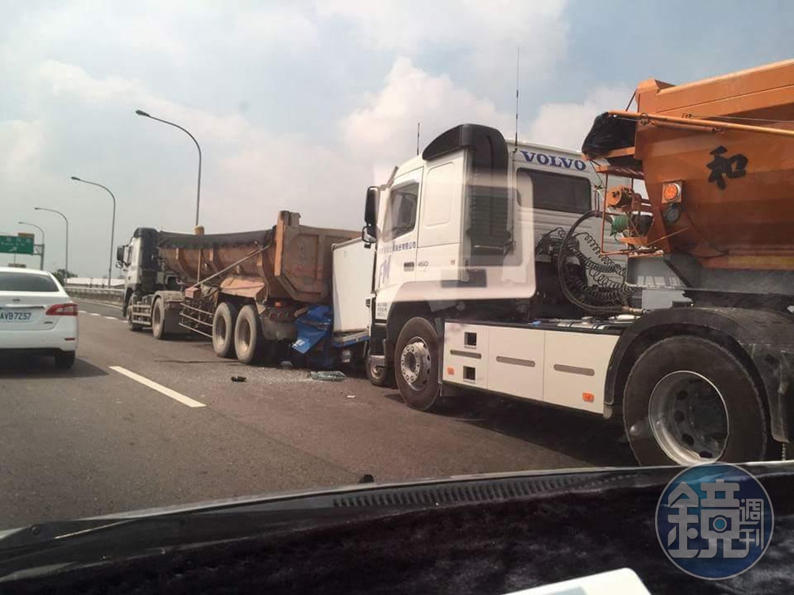 26日上午10點半,台中74號快速道路南下往烏日路段,一輛砂石車撞上一輛小貨車,小貨車頂不住強大的撞擊力道,再重重撞向前方砂石車;小貨車就如夾心餅乾般被夾在2輛大車中央,導致小貨車車頭嚴重變形,駕駛受困車內,喪失生命。