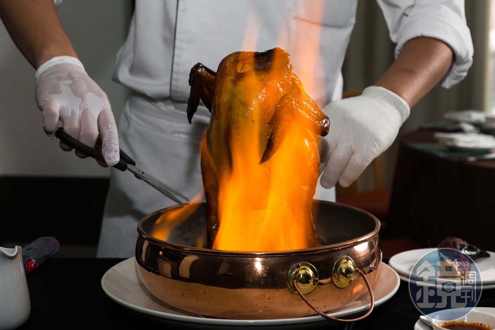 這套桌菜主角吃的是皮薄肉厚,法國育種、雲林畜養的「薩索雞」。晶英軒燒臘房主廚尤憲皇把爐烤後的薩索雞推進包廂,端坐於銅鍋上的雞身,已經烤得油油亮亮,教人蠢蠢欲動,主廚拿起當歸、高粱藥酒澆淋在埋伏於鍋底滾燙的麥飯石上,點火後火光一路沿著雞身向上,嗆出藥酒香氣。