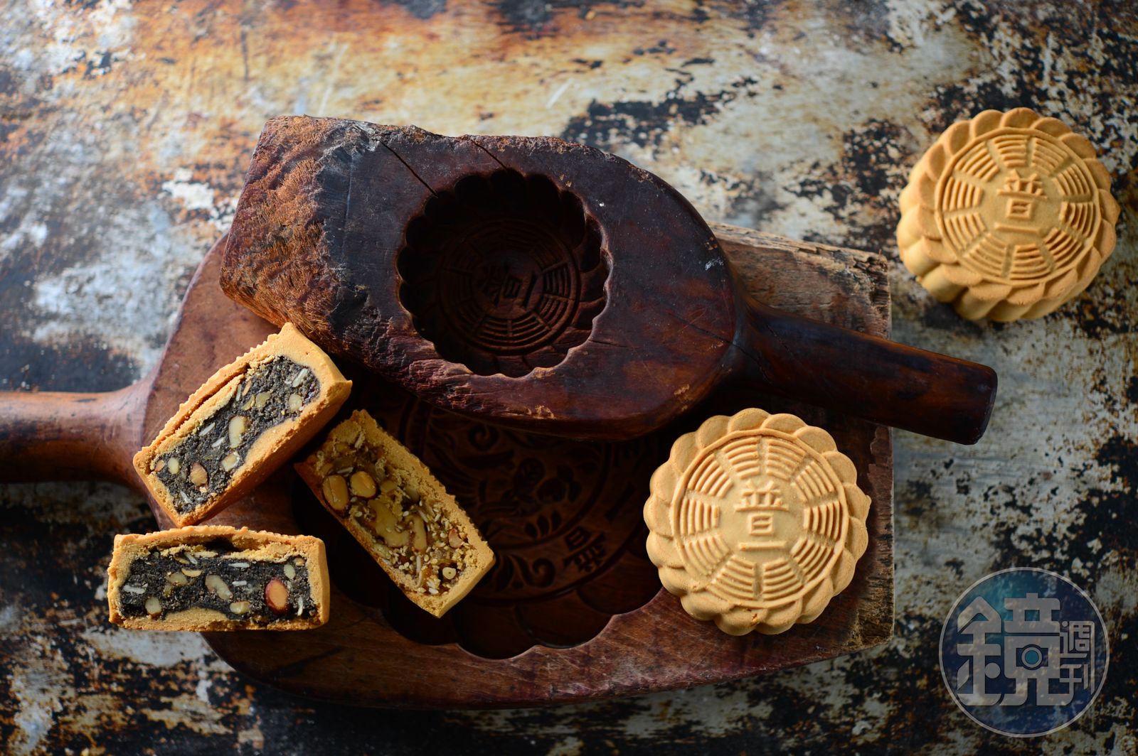 眼前這顆有著花紋線條的「提漿月餅」,一度失傳現在又在鄉間現身,沒想到卻成了我的新歡。提漿月餅的餅皮有如餅乾般酥爽不油,內餡滿是堅果香氣,「製作1顆提漿月餅的時間可以完成8顆廣式月餅。」