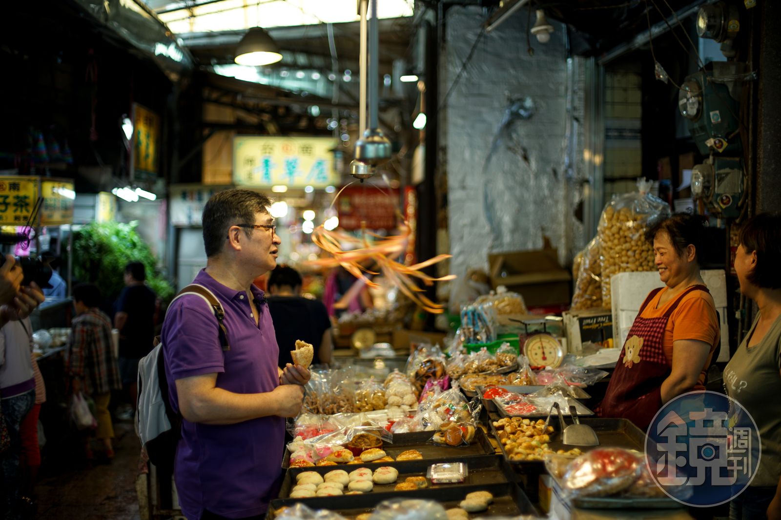 清晨時段我們跟著王浩一走在水仙宮菜市場,他經過水果攤時,挑選果子問價格,經過魚攤時,老闆娘喊著說要送他虱目魚頭,讓他回家煮魚湯,抵達市場裡老餅鋪「寶來香 」時,他接過老闆之一的王清源手中的竹筷子,老闆回頭去忙烤餅,他就自個兒蹲在走道邊為發糕點上「四紅」。