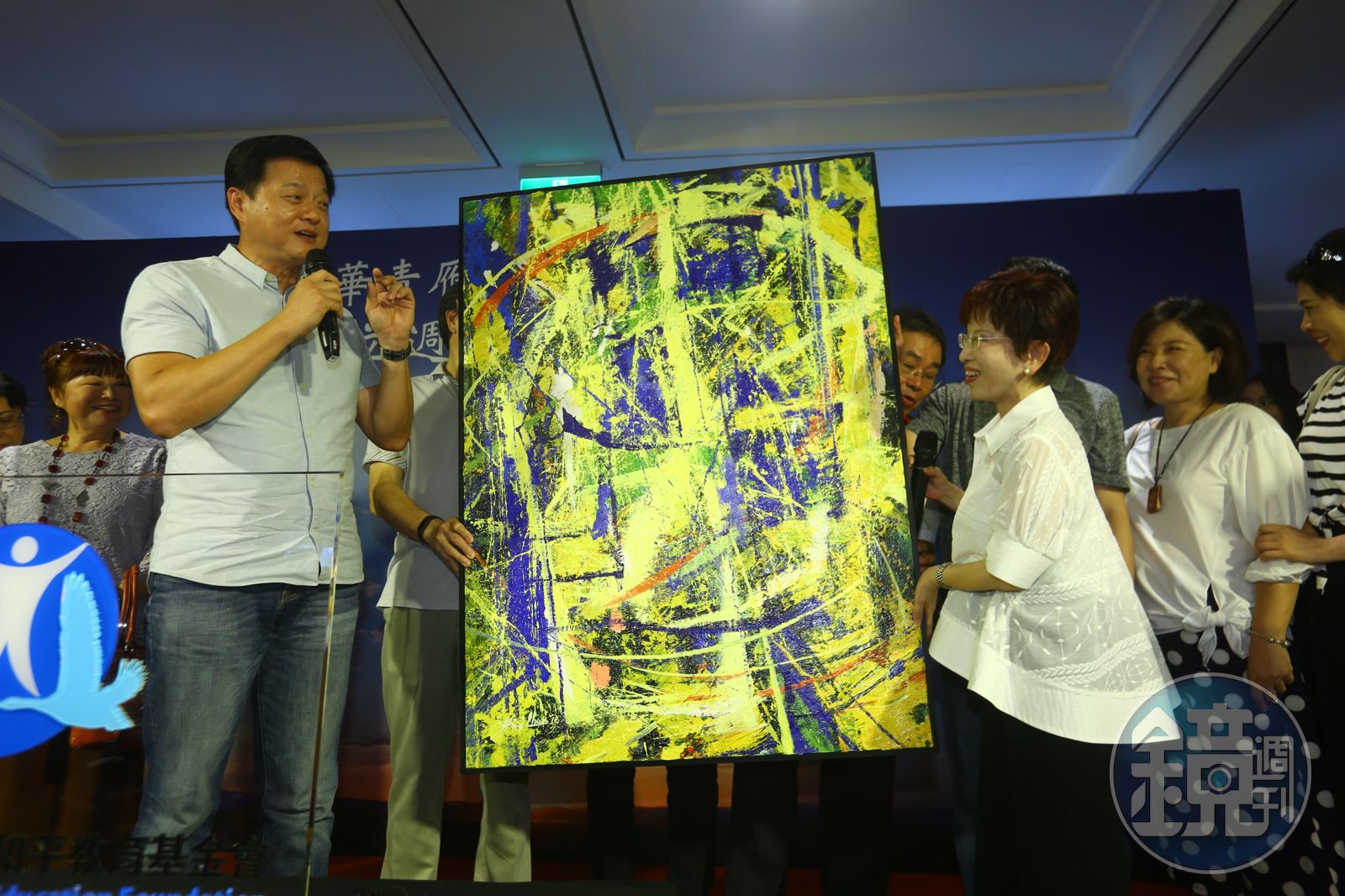 周錫瑋帶了一幅《奔放年代》畫作,他說,「這幅黃色的畫提醒我們是黃皮膚、黑眼睛、黑頭髮的中華民族子女,不要忘本,要振興中華文化,讓中華民族成為世界上最強盛的民族之一。」