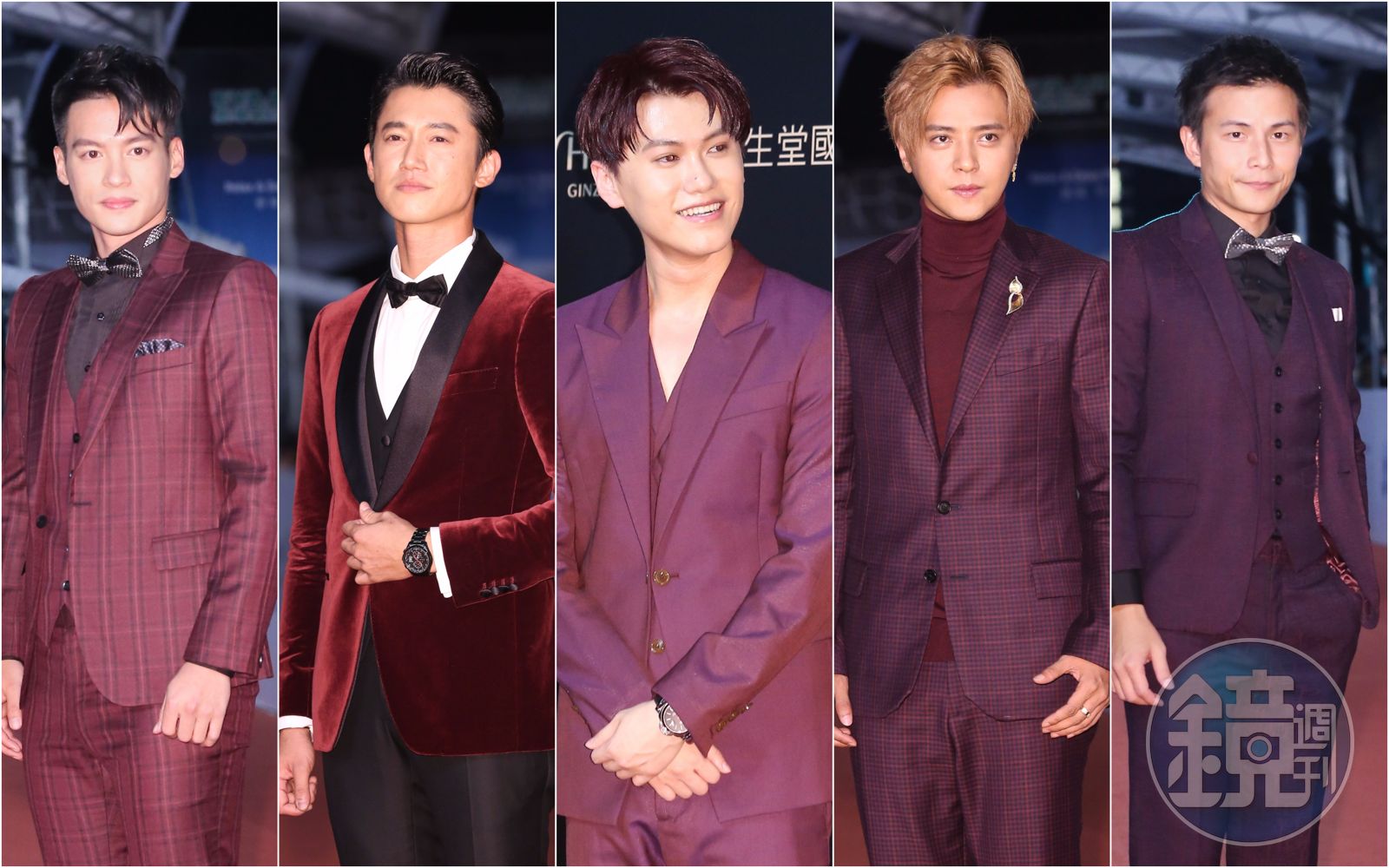 此外金鐘獎入圍常客吳慷仁也穿上酒紅色毛料西裝,他大膽選用除了黑色西裝外的選擇。只不過這季節還是太熱,吳慷仁走完紅毯整張臉紅到耳朵。