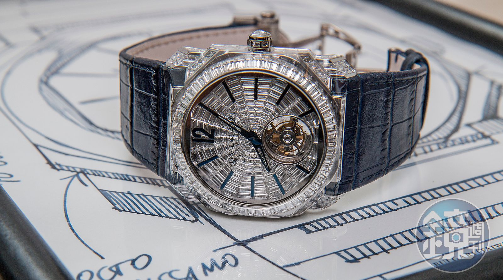 今年寶格麗重點錶款:Octo Finissimo超薄鏤空陀飛輪腕錶,全球限量僅50只,原廠特別將編號1號帶到台灣展出。Octo Finissimo超薄鏤空陀飛輪腕錶締造了全球最纖薄鏤空陀飛輪的世界紀錄,BVL 368機芯僅有1.95mm,而全錶也僅有5mm;40mm錶殼為鉑金材質,至於鉑金錶冠則裝飾黑色陶瓷,搭配黑色鱷魚皮錶帶與鉑金錶扣,定價NT$4,080,000。